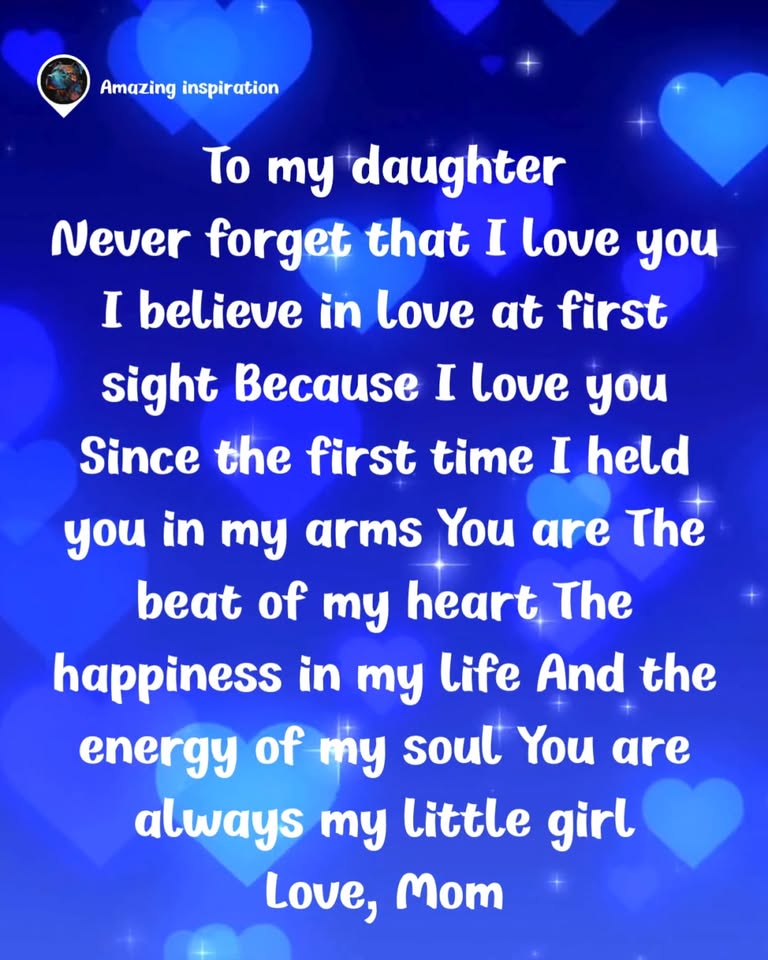 To My Daughter ๐ Never forget that I love you ๐ธ From the moment I held you, you became the beat of my heart ๐ My happiness, my soul, my forever little girl ๐ฉโ๐งโค๏ธ