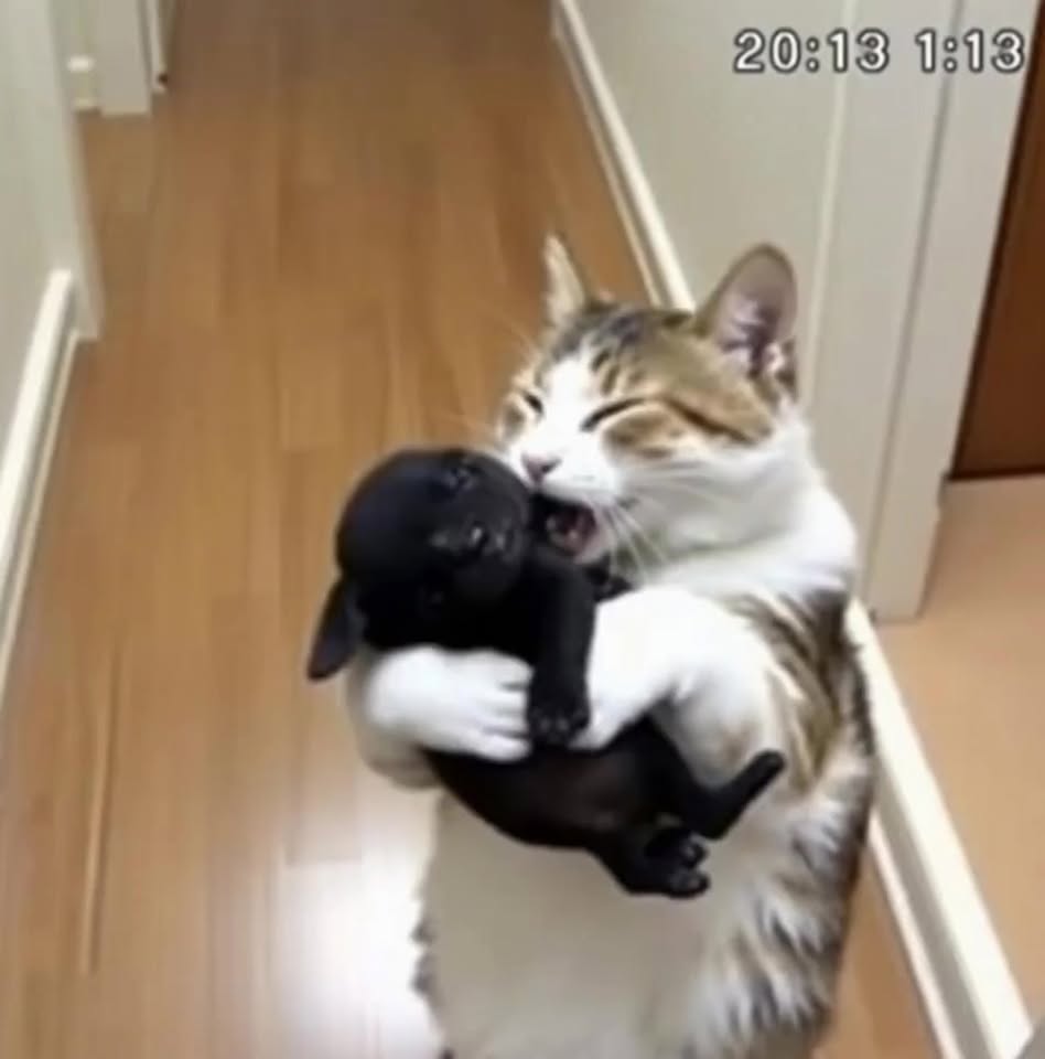 Marsa, my tabby, was carrying a tiny black puppy in her teeth.