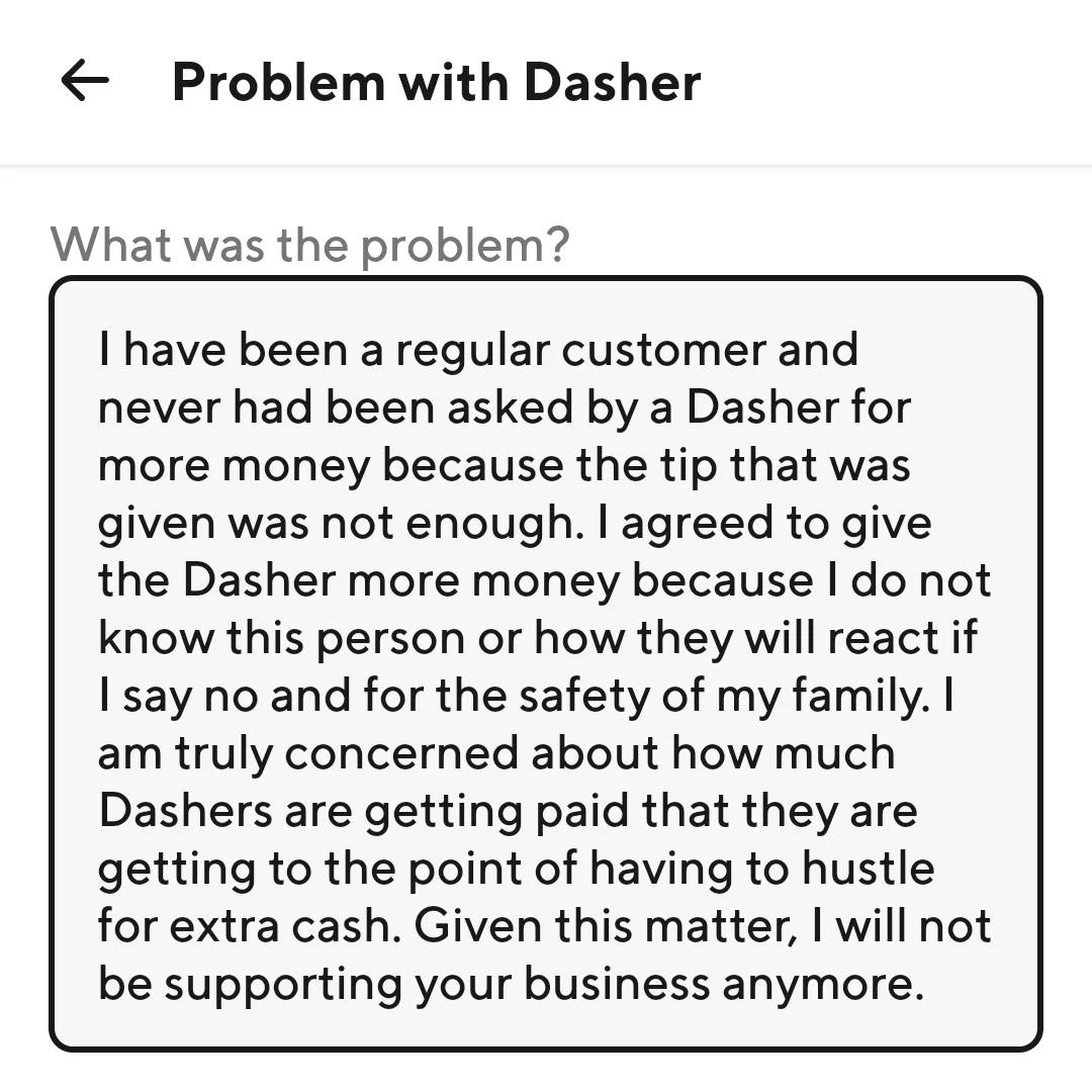 I was asked for more money because it was not enough. It was a big order from the cheesecake factory. $162. I tipped $10.00 and was asked for more money. I live 5 Miles away from the restaurant. I did tip the person 10 dollars more cash but I really did it because I was scared of any repercussions with me or my family. I was in shock. This has never happened to me and I use multiple apps (uber, doordash, instacart ect)