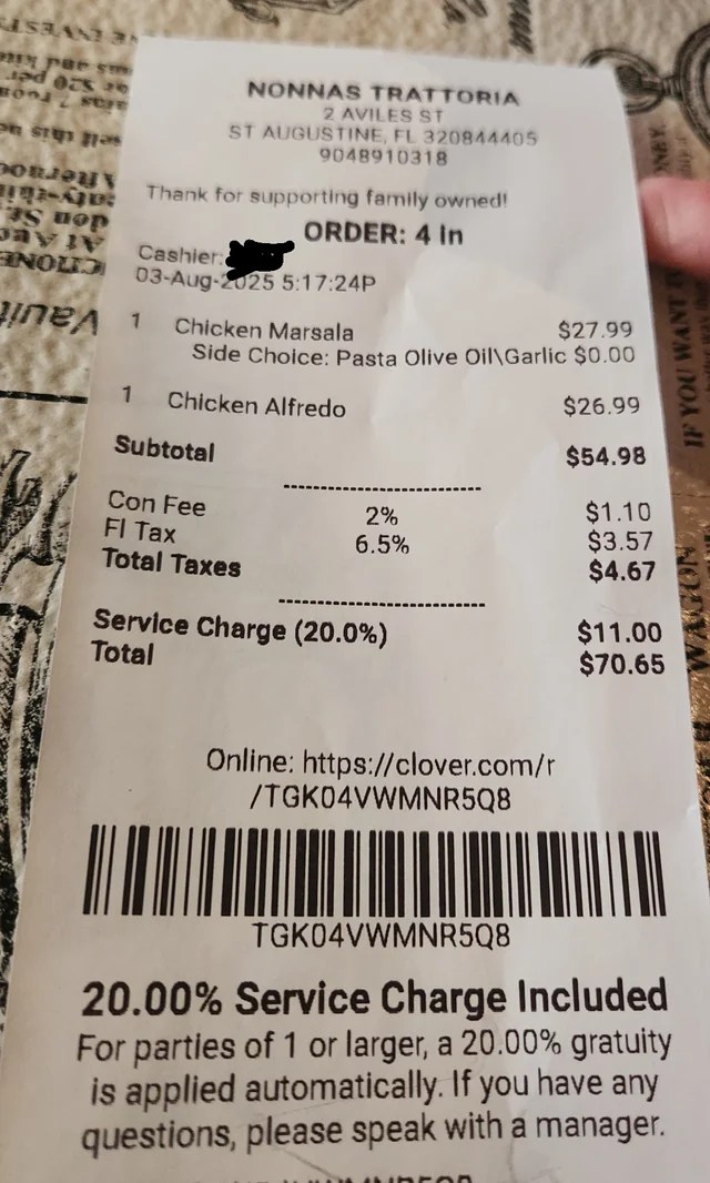 We went to this little Italian restaurant in St Augustine FL a few days ago and all of a sudden the check came and we found out this restaurant forces you to pay 20% tip. There was nothing in the restaurant or on the menu saying this. To add on, the water was horrible and rude which I assume was because he knew he’d get a tip and when he asked he said everyone in St Augustine does this… They don’t. My moms German so I assume he thought we were tourists when we literally live barley an hour away and come here a lot. No one does this.