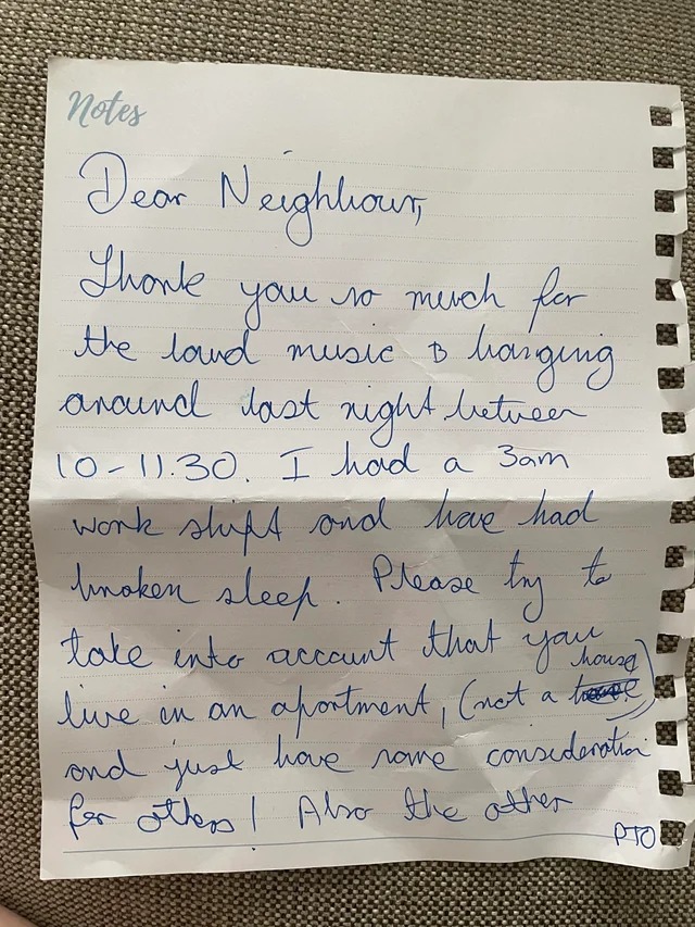 Why would someone put such a note under the neighbourβs door? I have never played loud music, banged or run my dryer at 3am! They didnβt leave a name so I donβt know if they are next door, on the lower or upper floors. My next door neighbour does play music but itβs not bothersome and the noise otherwise is just normal for an apartment. Iβm a bit creeped out since I live alone and it seems the person has fixated on me being the source of their woes but I have no way to reach out to them. Is it just me or is this a rude note to leave a neighbour? What should I do?