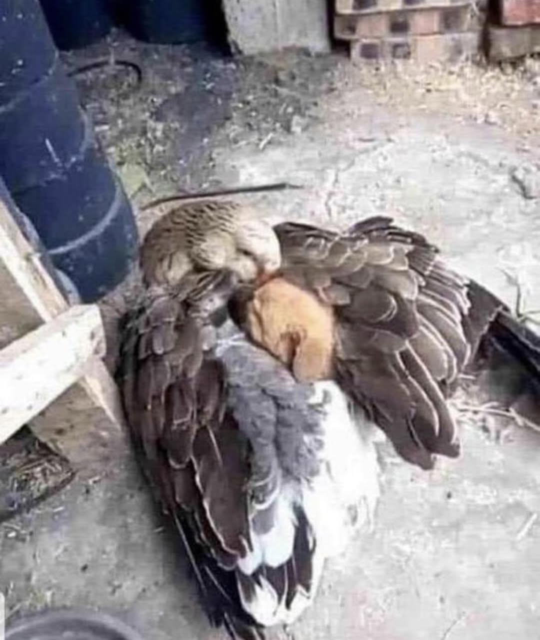 A man finds a goose that was shaking with cold stuck to a pole in Montana. As he got closer he realized, wrapped up in her wings, was a tiny puppy she was shielding from the freezing temperatures.
