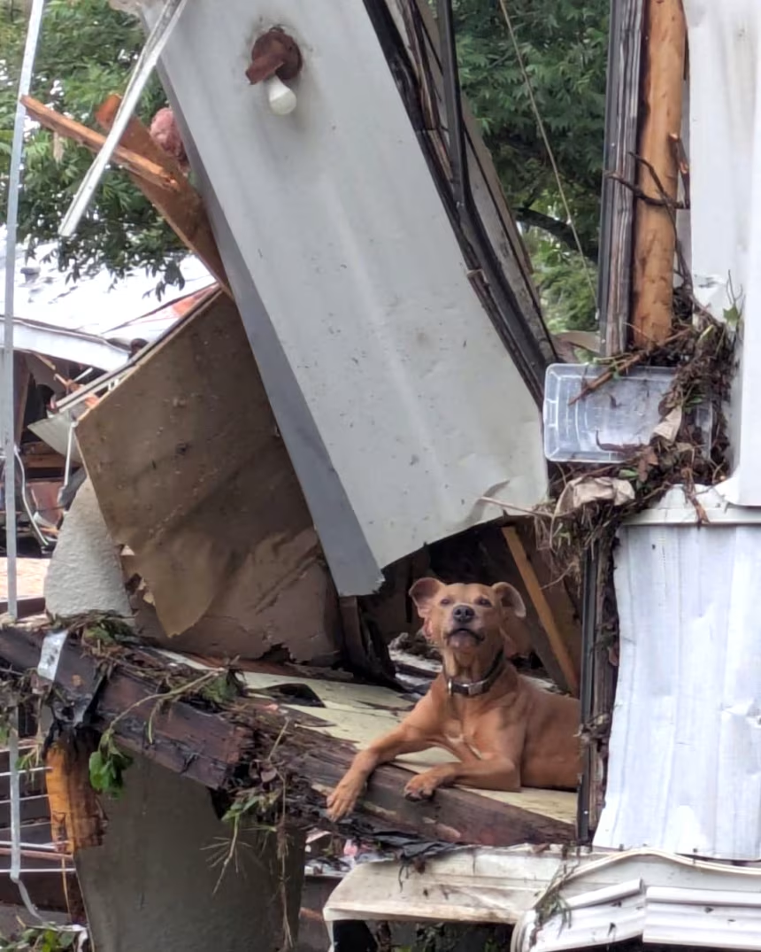 A photo posted on the Austin Pets Alive! Facebook page shows Superman just as rescue workers found him: a muscular light brown dog wearing a collar, sitting among twisted metal and broken wooden beams, patiently waiting for his family to come back.
