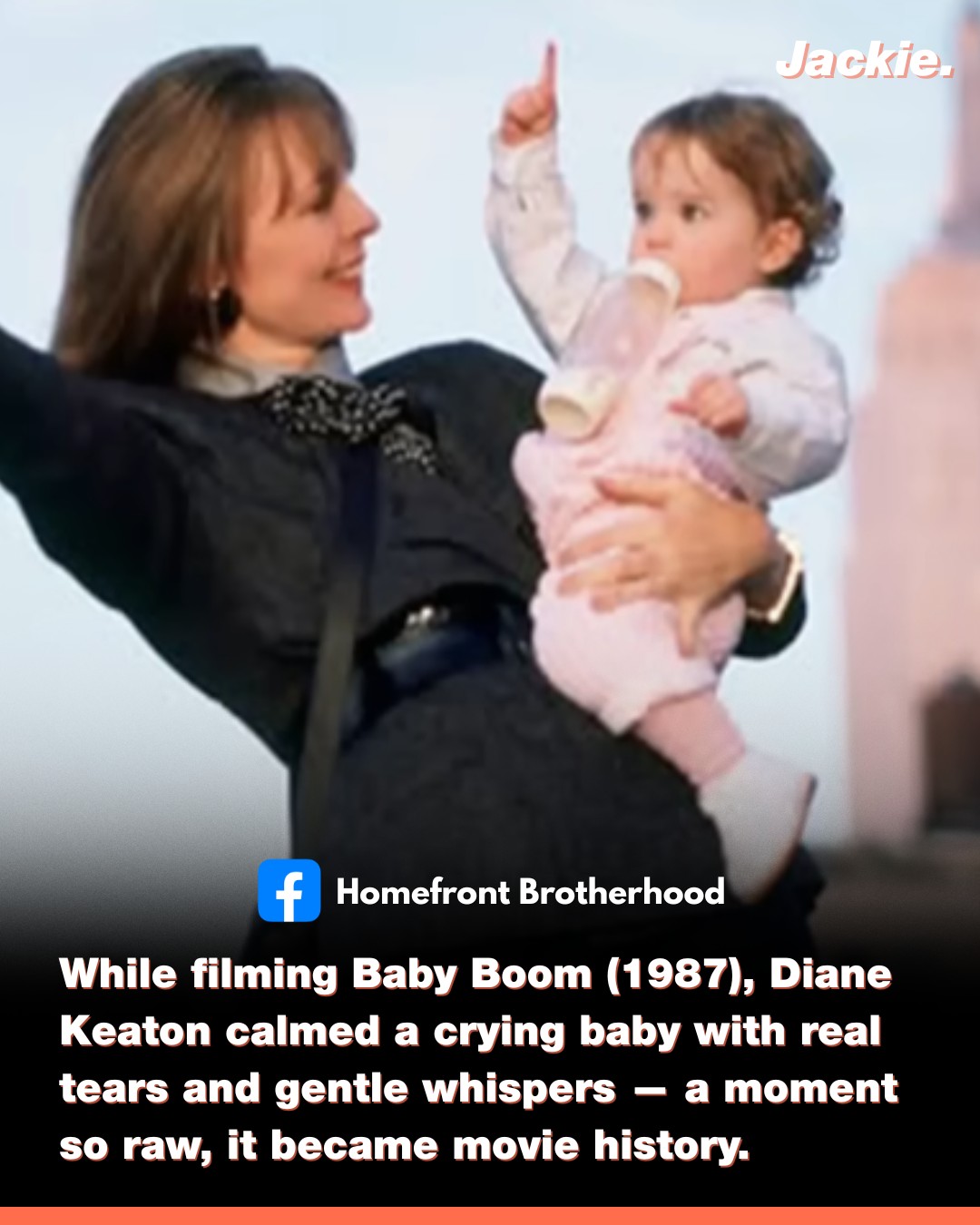 “During the filming of Baby Boom (1987), Diane Keaton held a crying baby that refused to calm down. Instead of waiting for a reset, she whispered softly, rocked her gently, and began to cry herself. The cameras kept rolling. That unscripted moment made the final cut — and became one of the most heartfelt scenes in the film.