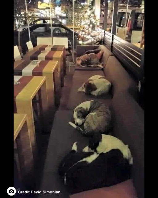 “This is a coffee shop in Greece which opens its doors every night to these poor dogs so they won’t freeze to death outside.”