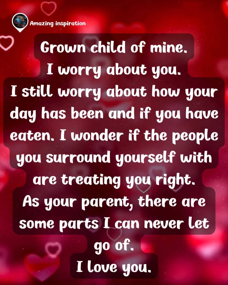 Grown child of mine 💕 I still worry about you 🌦️ I wonder if you’ve eaten 🍽️ if your day’s been kind 🌸 No matter how old you get, I’ll always love you ❤️
