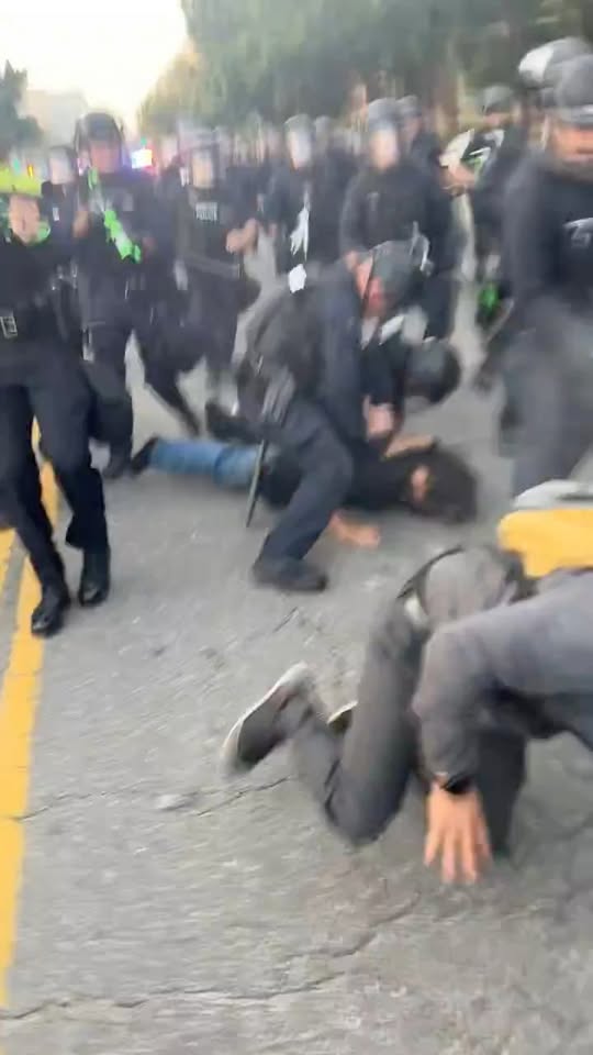 HAPPENING NOW: Incredibly chaotic scene in downtown Los Angeles. LAPD pushing forward a skirmish line and violently arresting anti-ICE protesters.