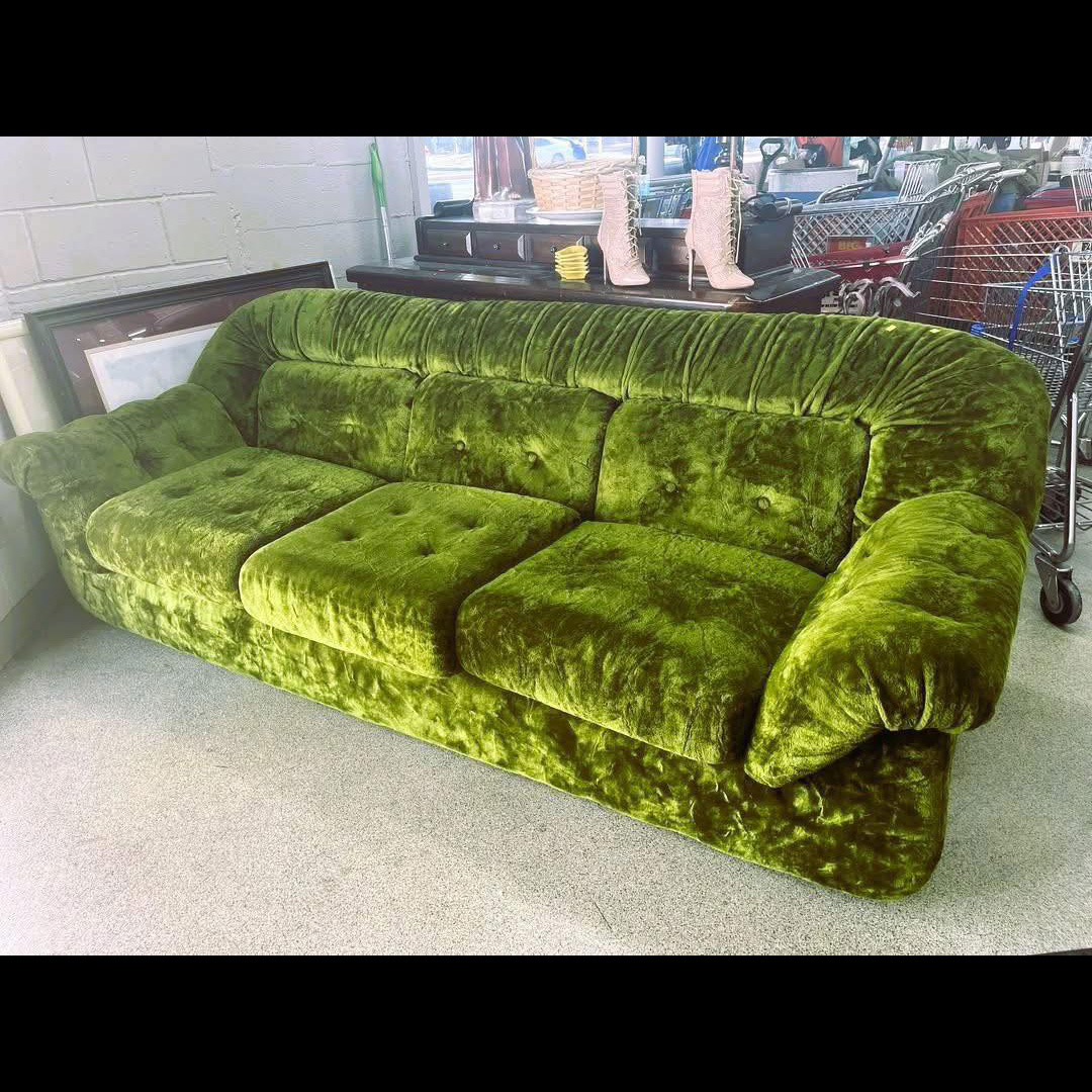 A massive green velvet couch that clashes with absolutely everything we own. It takes up half our living room and looks like it came straight from a 1970s disco basement.