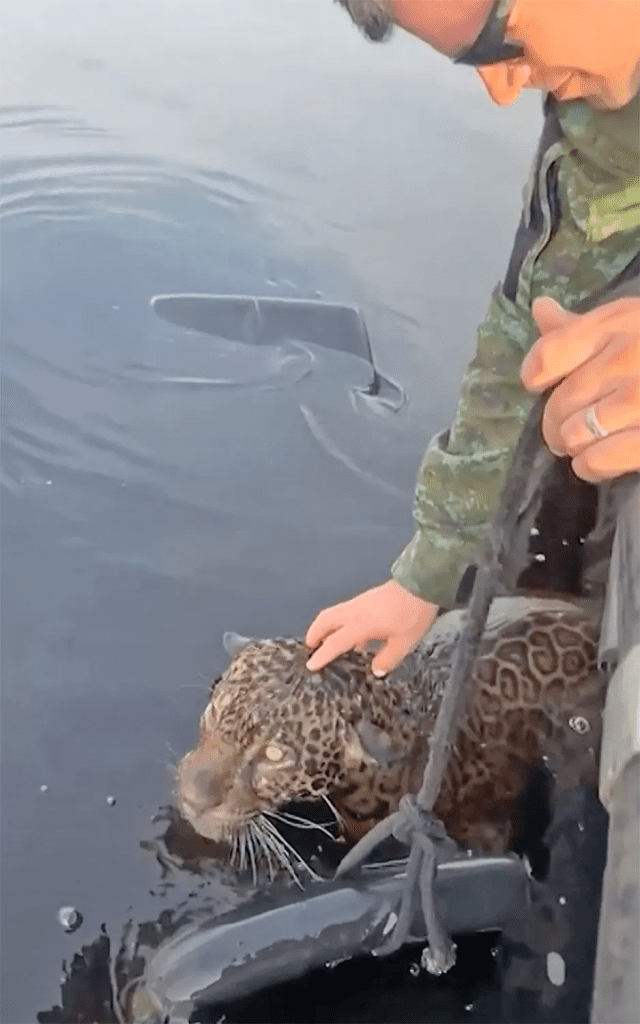 Video from the scene, obtained by Newsflare, shows the animal cautiously swimming toward the agency’s boat as officers extend a makeshift flotation device to give the big cat a place to rest, rather than treading water. Despite the animal’s visible distress, the jaguar grips the support and allows itself to be guided to safety.