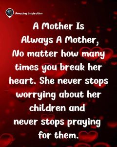 A Mother is always a Mother ๐ฉโ๐งโ๐ฆ No matter how many times you break her heart ๐ she never stops worrying ๐ and never stops praying ๐ for her children ๐