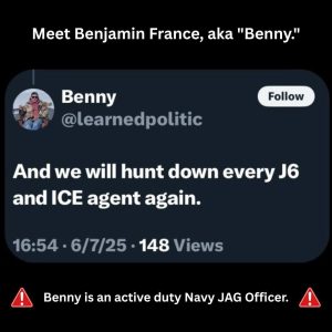 ๐งตMeet Benjamin France, aka “Benny.” Benny made a comment threatening to “hunt down every J6 and ICE agent” three days ago on X. Why should we care that Benny is threatening federal agents? Because Benny is an active duty Navy JAG Officer, according to a source familiar with the matter. Source: Shoe (X) @samosaur As […]