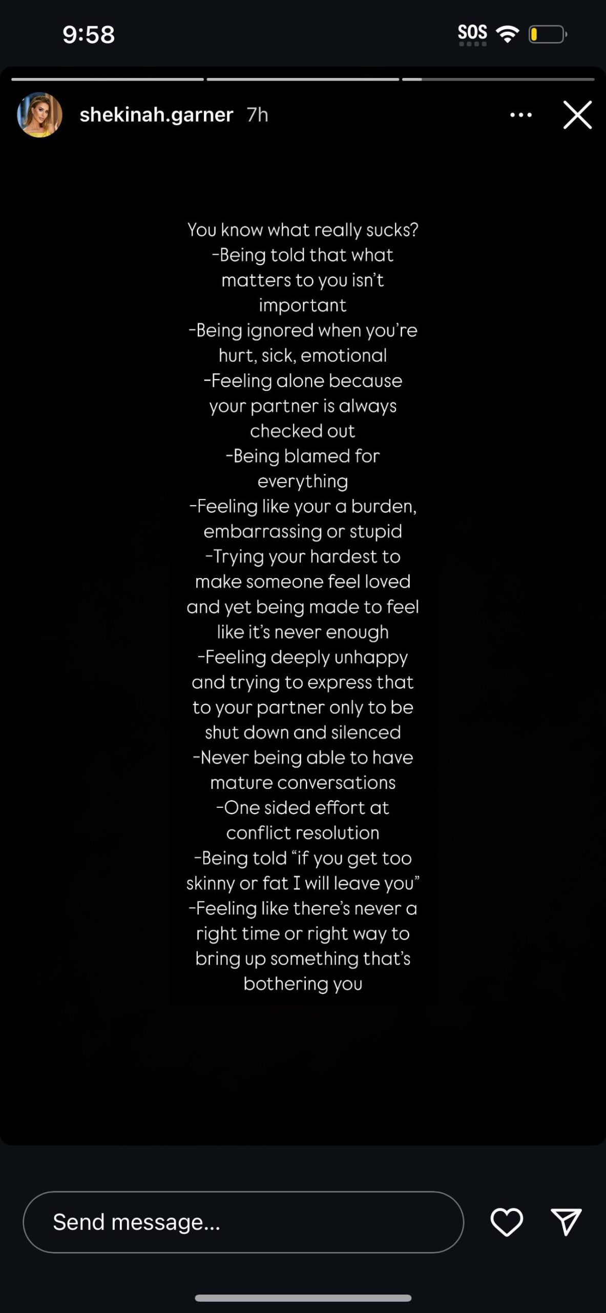 I just saw Shekinah’s Instagram story …. I wonder what this means? I feel like Sarper has changed and sacrificed so much for her. If she truly STILL feels this way, (because a lot of these sentiments are some she had at the beginning of their relationship) then she should have never brought him to the United States with her.