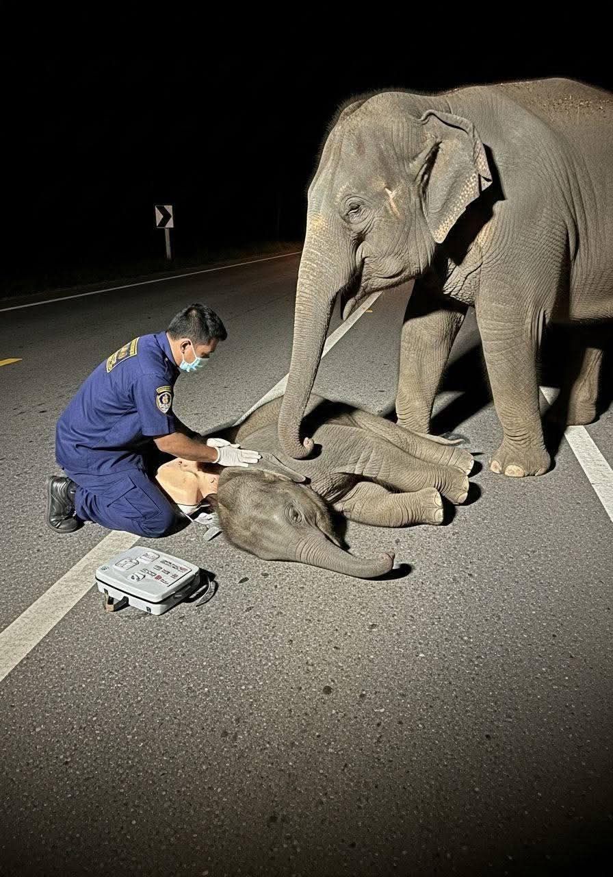Then came Mana Srivate, a Thai rescuer with 26 years of experience — off duty, but driven by instinct and compassion. He knelt beside the lifeless calf and began performing CPR — elephant CPR.