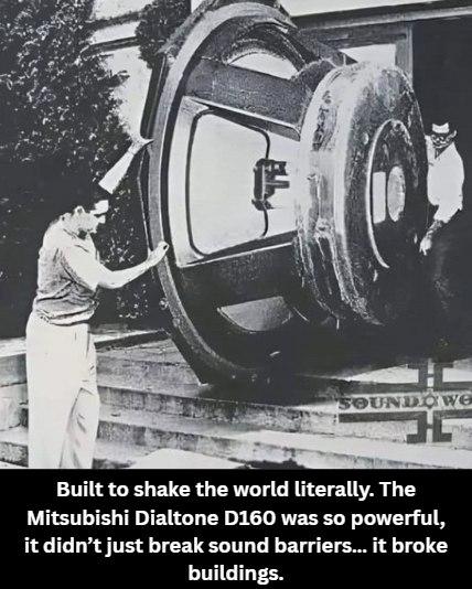 This is the Mitsubishi Dialtone D160, the largest subwoofer ever built, with 60 inches in the 1980s. Weighing 800kg, it can easily shatter windows and produces small earthquakes that can be felt like ground vibrations within a 2-kilometer range. At the Koriyama factory, the test was conducted at first in the measuring room, but was stopped because the ceiling lamps fell due to vibration. The outdoor test appeared to have a negative impact on the neighborhood. At a distance of about 100 m from the speaker, the sound was felt, but at a greater distance, it was transmitted as vibration and noise on the earth instead of an audible sound. Within a 2-kilometer radius of the factory, damage such as vibrations, small earthquakes, as well as noises from walls and windows occurred.