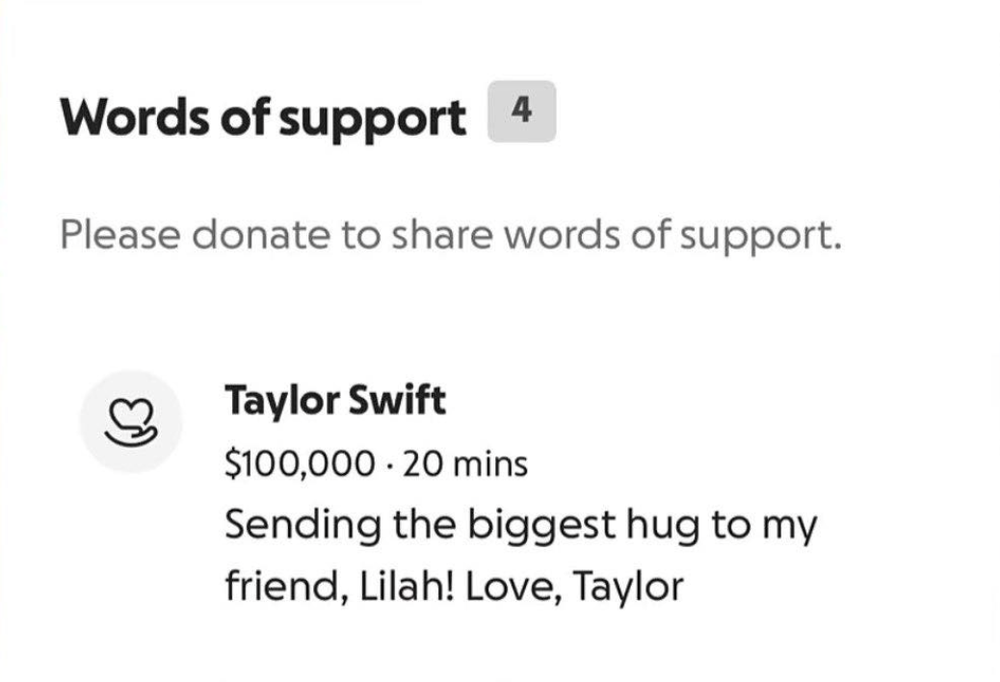 While Taylor’s contribution was extraordinary, Lilah’s journey has touched thousands of hearts. So far, more than 4,500 people have donated to her fundraiser, raising over $209,000.