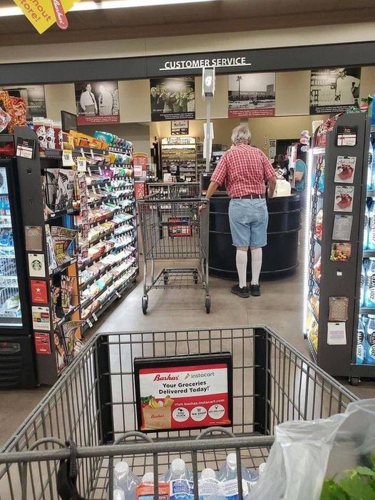 Waiting in line to pay for groceries while maintaining a 6ft distance, this man …