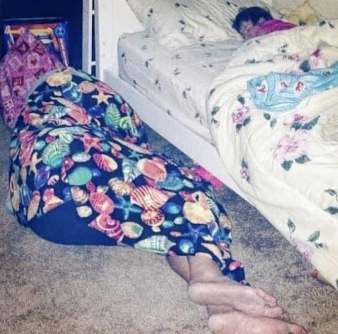 When it was time for bed she cried & said that she didn’t want any monsters to get her. We didn’t know her whole story yet; we didn’t know if ‘monsters’ had indeed hurt her at night before. My husband calmed her down, said a goodnight prayer, and asked if she needed anything else before bed. She asked him again to promise no monsters would get her if she fell asleep. He promised, and to put her at ease, this is how they slept.